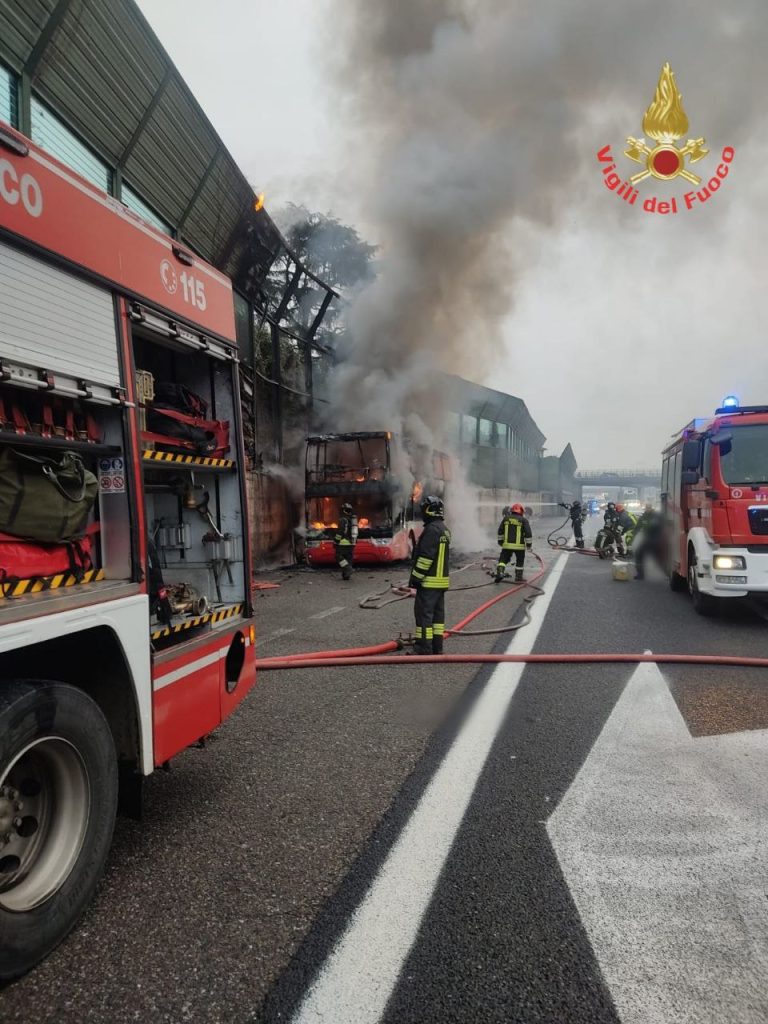 Bus in fiamme sulla A4: intervento dei vigili del fuoco MB, nessun ferito