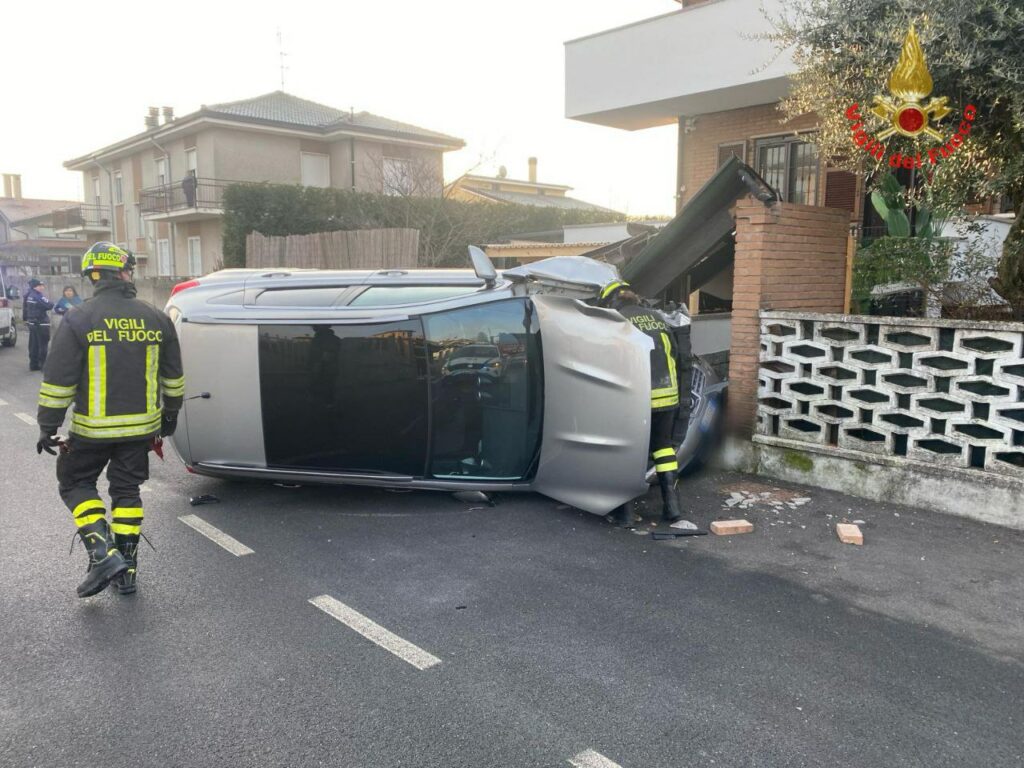 Ha perso il controllo dell’auto che di è ribaltata e si è schiantata contro il cancello pedonale di una abitazione, abbattendolo. Sull’asfalto è rimasta la vettura ribaltata su un fianco e la tettoia dell’ingresso della casa, distrutto. L’incidente è accaduto a Cogliate martedì 30 gennaio attorno alle 8.20.
