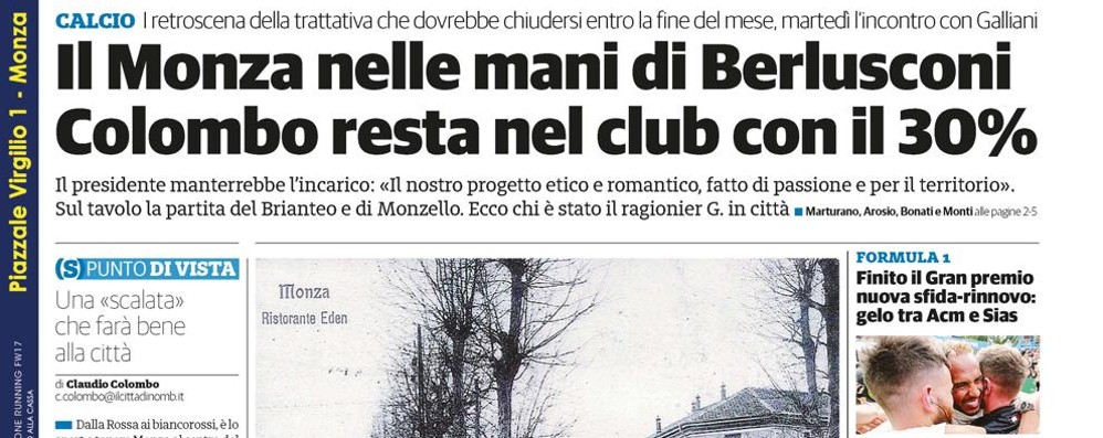 Ci sono Berlusconi e il Monza in apertura del Cittadino di giovedì 6 settembre. Il ritorno nel mondo del calcio dell’ex presidente del Milan sulla piazza biancorossa si è rivelato nelle ultime 48 ore con una trattativa che darebbe il 70% del club a Berlusconi, la presidenza a Nicola Colombo e Adriano Galliani nel ruolo di amministratore delegato (lo stesso che ricopriva nel Milan). Sul giornale in edicola l’approfondimento, i ritratti dei protagonisti presenti e passati, le interviste e le reazioni della città alla notizia.