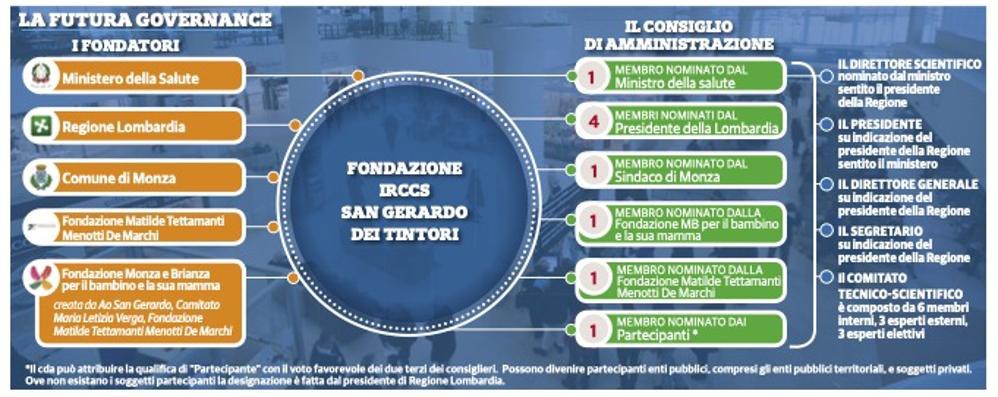 La governance sarà affidata a un consiglio di amministrazione di cui faranno parte prima di tutto i fondatori: un posto in cda a ciascuno per ministero della salute, Comune, Fondazione Tettamanti De Marchi, Fondazione Monza e Brianza per il bambino e la sua mamma, quattro invece riservati alla Regione.
