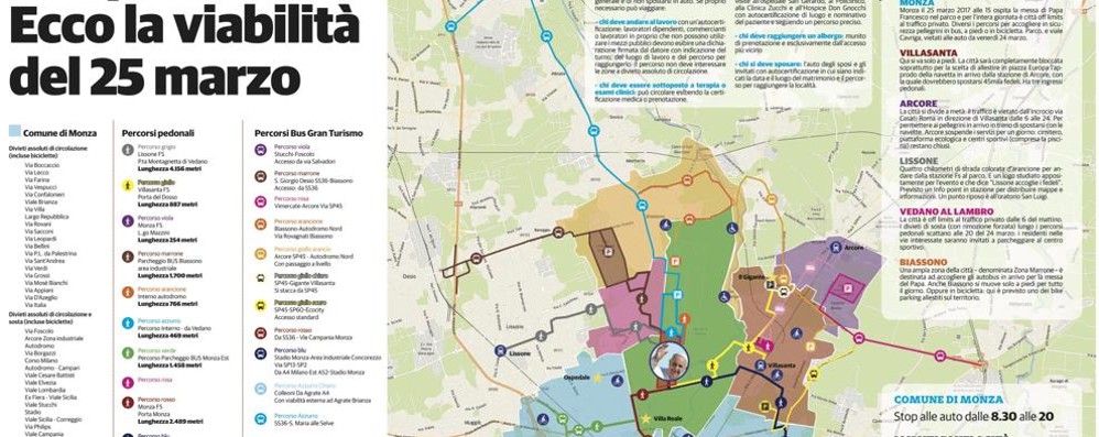 Blocco totale del traffico a Monza dalle 8.30 alle 20 di sabato 25 marzo in occasione della visita pastorale di Papa Francesco con messa nel parco. Il Cittadino ha disegnato una mappa con i divieti principali, i percorsi pedonali, i parcheggi per le bici, alcune importanti informazioni sulle deroghe per chi deve circolare (per esempio per lavorare) e sulle decisioni dei sei Comuni coinvolti nell’area off limits: che sono, oltre a Monza, Villasanta, Arcore, Vedano al Lambro, Biassono, Lissone.