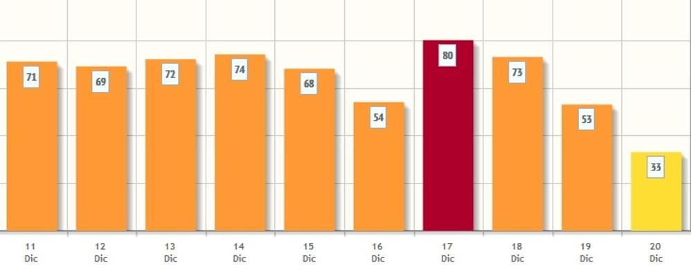 Due giorni scarsi di pioggia debole. Poco per ripulire l’aria di Monza e Brianza dopo diciassette giorni oltre il primo limite di allerta del Protocollo regionale Aria; il livello del Pm 10 ha superato i 50 microgrammi per metro cubo con punte decise oltre il secondo livello a 70 mg. Una media calcolata sui dati delle centraline di Monza – via Machiavelli, Monza – Parco, Meda. La perturbazione martedì ha fatto scendere il livello a 41 e a 46 mercoledì 22 dicembre. Prima però del ritorno previsto dell’alta pressione nei giorni verso Natale e nella settimana che porta a capodanno.