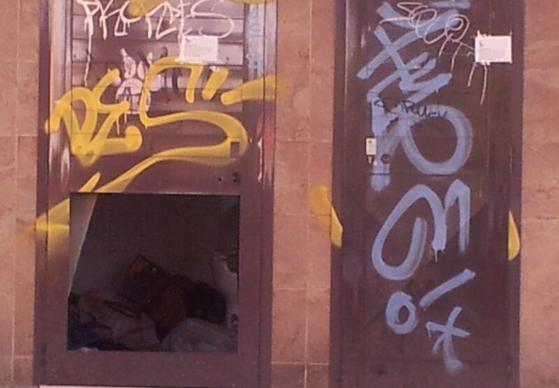 Le porte rotte e coperte di graffiti, un odore nauseabondo al semplice avvicinarsi e la porta centrale rotta utilizzando lo spazio come magazzino dei senzatetto che vi hanno accatastato sedie, sacchetti di plastica pieni di cibo e di lattine di birra, abiti e coperte.