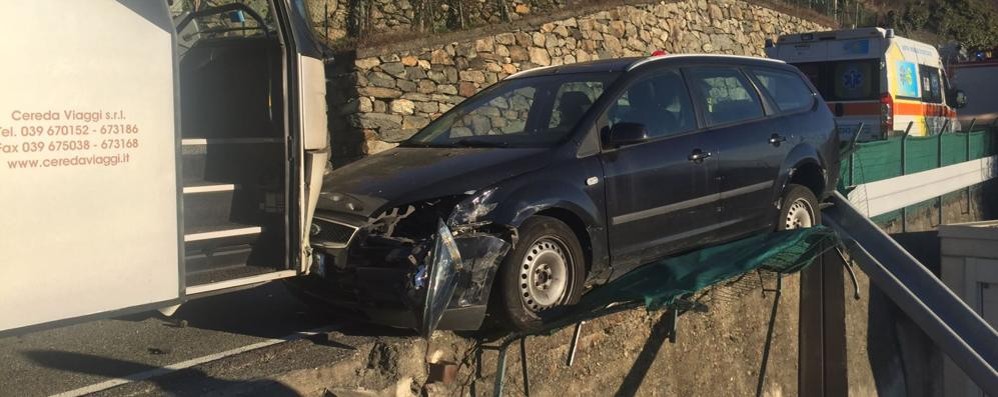 Risultato: guard rail divelto, paraurti del pullman distrutto, macchina in bilico sul ciglio della scarpata e schiantata frontalmente sull’autobus.