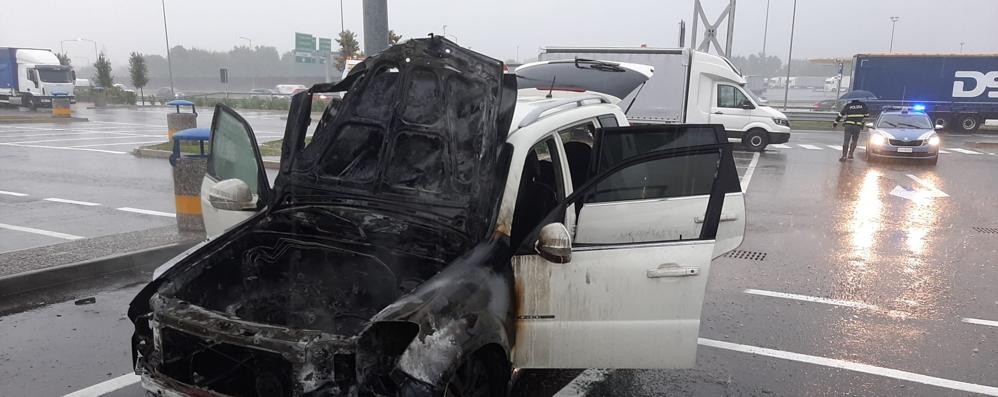 Incendio autovettura, per cause in via di accertamento, senza feriti, martedì 22 settembre attorno alle 8, nell’area di servizio Brianza Sud lungo la autostrada A4, all’altezza di Agrate Brianza. Sul posto squadre del Comando dei Vigili del fuoco di Monza e Brianza con una autobotte di Monza e un mezzo di primo soccorso di Carate Brianza. Presente la polizia stradale.