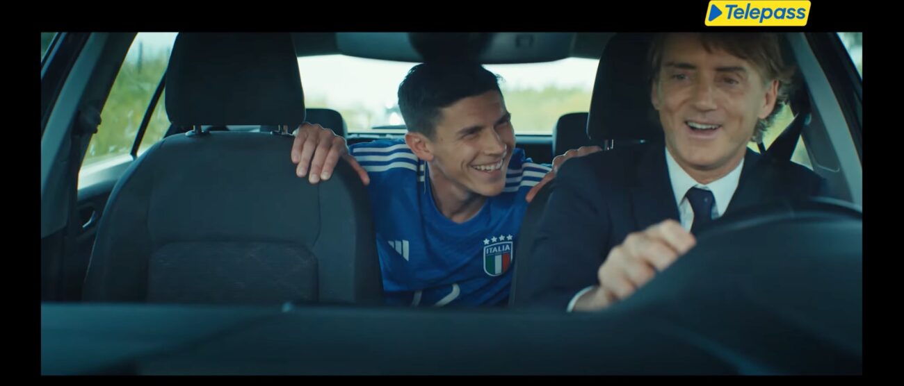 Il capitano del Monza insieme a Matteo Cancellieri, attaccante della Lazio, spiega a Mancini, che nel frattempo è rimasto senza carburante, le soluzioni proposte dall’azienda di telepedaggio che ha siglato nei mesi scorsi una partnership con la Federazione Italiana Giuoco Calcio (FIGC). I due giovani calciatori spingono l’automobile fino al distributore di benzina più vicino e smartphone alla mano fanno vedere al commissario tecnico come si può pagare. E servendosi della app, i nativi digitali dimostrano che è possibile pagare anche i parcheggi, ricaricare l’automobile nelle apposite colonnine, noleggiare monopattini, biciclette e scooter. Indossato il casco, i tre inforcano bici e monopattino tra i saluti di chi li vede passare. In sella allo scooter sale, però, solo Mancini “inseguito” bonariamente dai due giovani e tutti e tre insieme fanno il loro ingresso allo stadio tirando qualche calcio al pallone.