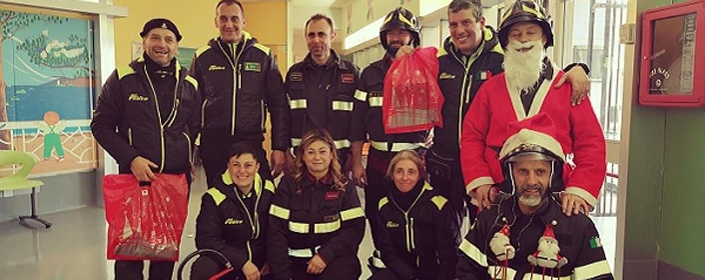 A Natale tutto può succedere, compreso che i vigili del fuoco si trasformino nell’uomo in rosso più amato al mondo o in elfi pronti a distribuire doni e sorrisi tra le corsie di un ospedale. Erano una decina mercoledì i pompieri in arrivo dai distaccamenti di Carate Brianza, Desio e Seregno, permanenti e volontari, dal comando di Milano e dal nucleo cinofilo di Milano per far visita ai bambini nel reparto di pediatria dell’ospedale San Gerardo di Monza.