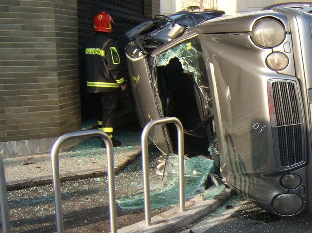 Cesano, carro funebre si ribaltae sfonda la vetrina di un negozio