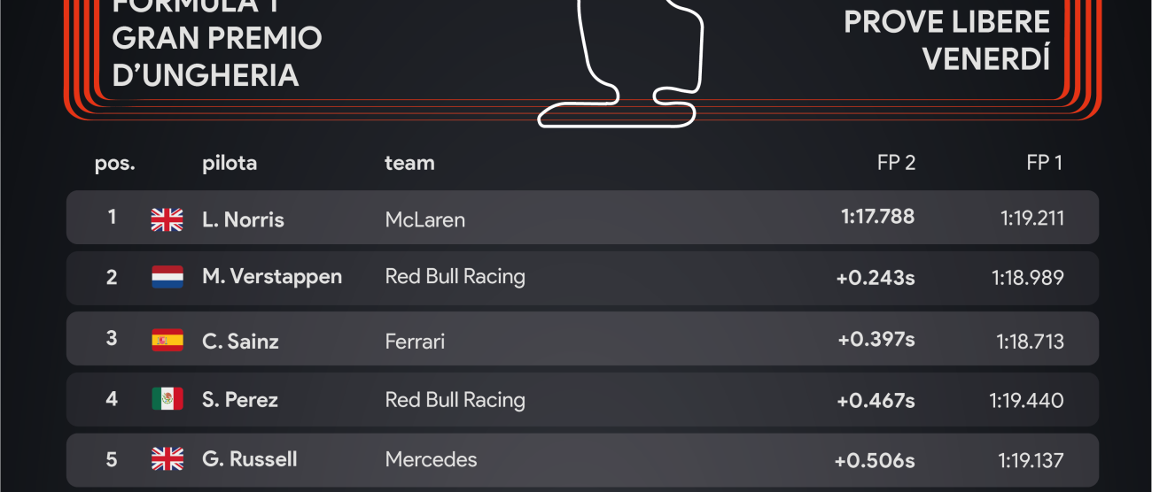 Dopo una prima sessione di prove libere molto positiva per Ferrari con Carlos Sainz primo con due decimi di vantaggio su Max Verstappen e Charles Leclerc in terza posizione, le somme tirate a fine giornata vogliono come favoriti per il Gran Premio di Ungheria Red Bull, McLaren e Mercedes. Con Leclerc a muro dopo soli otto giri e Sainz che conquista comunque il terzo tempo, la seconda sessione di prove libere del venerdì ungherese vede Lando Norris primeggiare sulla Red Bull di Max Verstappen con due decimi di vantaggio. All’Hungaroring si prospetta un altro weekend di battaglia tra l’olandese e l’inglese, con le Mercedes di George Russell e Lewis Hamilton (quinta e settima nel secondo turno di prova) pronte a tendere l’agguato.