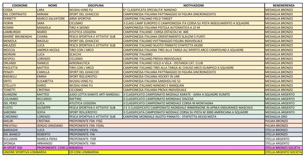 Saranno consegnate 19 medaglie di bronzo, 5 medaglie d’argento e 1 medaglia d’oro, poi 2 Palme di bronzo e infine le Stelle: 3 di bronzo e 3 d’argento. Tra loro tanti campioni italiani, come Miriam Del Contrasto, che ha vinto il titolo di pattinaggio di figura-sincronizzato sul ghiaccio, Marco Ferretti per le armi sportive (field target), Sara Fiorin, terza classificata agli Europei di ciclismo. E ancora: Manjola Konini campionessa nazionale di pistola 25 metri, Mario Lamburghi che detiene il titolo per la corsa a ostacoli sui 400 metri, Luca Moroni, campione di scacchi. Ma la lista è lunga.